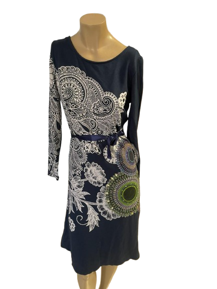 Precioso vestido de la marca Desigual, en color azul marino con un estampado blanco que resalta su diseño original. Una prenda versátil, ideal para cualquier ocasión, que luce impecable, como nuevo.